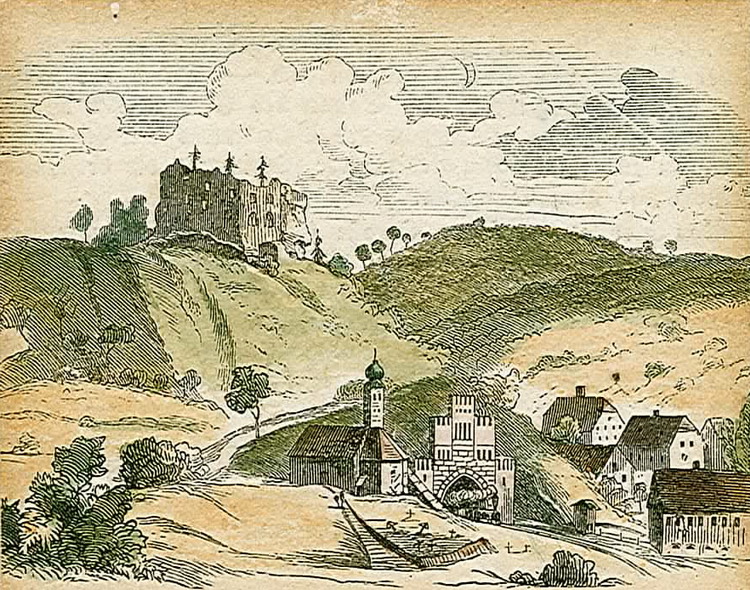 Burgruine, Brücke über den Hochspeyerbach und alte Kirche (Erbaut 1722)