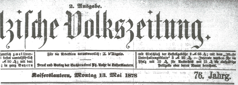 • „Pfälzische Volkszeitung vom 13. Mai 1878, Pfalzbibliothek Kaiserslautern, Seite 1.