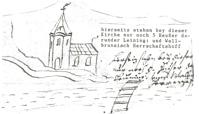 Nach dem plötzlichen Tod des Ritters von Einselthum, erbte dessen Neffe, der Junker Hans von Wallbrunn ein Drittel an der Herrschaft Frankenstein. 3 ) Der Junker übernahm die neue Art der Güterverwaltung seines Besitzes, in zusammengefasster Form, als Hofgut. Die Gründung des unterhalb, der bereits 1310 erwähnten Kirche 4 ), direkt auf der rechten Seite des Hochspeyerbaches liegenden Wallbrunner Hofes, ist eng verbunden mit den hier siedelnden Wiedertäufern. Die Existenz eines Hofes ist bis in das Jahr 1585 zu belegen. Ein Wiedertäufer namens Thüninges (Dionisos) findet in einem Dokument aus dieser Zeit Erwähnung als wallbrunnscher Hofmann, 5.) ein Indiz auf das rechts neben dem Steg über dem Bach gelegene kleine Hofgut. 6 )