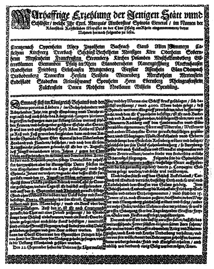 Der Verlauf der kriegerischen Ereignisse in dieser Region fand ihre publizistische Wiedergabe, analog moderner Kriegsberichtserstattung, in Form von Flugblättern. Die max. Auflage der Drucke beschränkte sich auf 300 Stück. Der Ablauf des Feldzuges ist gut rekonstruierbar an Hand der einzelnen erhaltenen Exemplare. ( W. Reininger/K. Stopp, Wahrhaftige Abbildung derjenigen Schlösser und Flecken welche Ambrosius Spinola in der Churpfalz am Rhein eingenommen im Jahre 1620/1621).